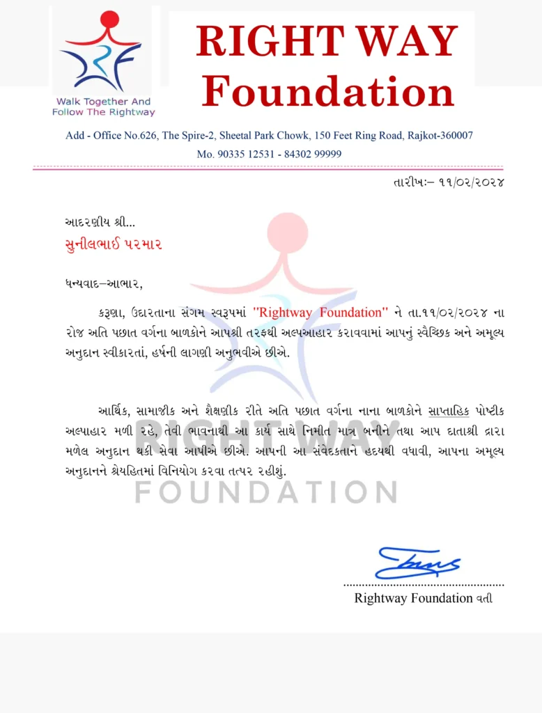 રાઈટવે ફાઉન્ડેશન એ એક બિન-લાભકારી સંસ્થા છે જે રાજકોટ, ગુજરાતની સીમાંત વસ્તીની સેવા કરવા માટે સમર્પિત છે. દરેક વ્યક્તિ વિકાસની તક મેળવવા માટે લાયક છે એવી માન્યતા સાથે સ્થાપિત, અમે અમારી શરૂઆતથી જ વધુ ન્યાયી સમાજના નિર્માણ માટે અથાક મહેનત કરી રહ્યા છીએ. અમારો બહુપક્ષીય અભિગમ ગરીબી અને અસમાનતાના વિવિધ પાસાઓને સંબોધિત કરે છે, જેમાં ખોરાકની અસુરક્ષા, અપૂરતા આવાસ, આરોગ્યસંભાળની મર્યાદિત પહોંચ અને શૈક્ષણિક તકોનો અભાવ છે. સ્થાનિક સમુદાયો, સ્વયંસેવકો અને હિતધારકો સાથે સહયોગ કરીને, અમારું લક્ષ્ય કાયમી સકારાત્મક પરિવર્તન લાવવા અને આપણા સમાજની સુખાકારીમાં યોગદાન આપવાનું છે. એક સમયે એક જીવનમાં પરિવર્તન લાવવાના અમારા મિશનમાં અમારી સાથે જોડાઓ.